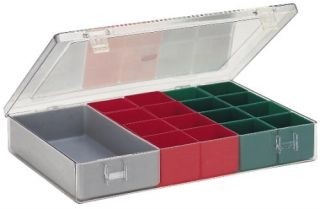 Vakkendoos van transparante polystyrol kunststof dat vrijwel onbreekbaar is. De inzetbakjes zijn gemakkelijk uitneembaar en in verschillende kleuren verkrijgbaar.